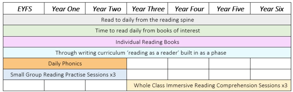 We strive to give our children the best start in establishing secure foundations in reading by ensuring that all children become successful, fluent readers by the end of Key Stage One. We believe this is achievable through a combination of high quality, discrete systematic phonics teaching combined with a language rich curriculum. Our primary intent is to create avid readers, which we believe is the foundation for any greater depth learner. While phonics and fluency will be emphasised in the early teaching of reading, immersive whole-class reading sessions later take precedent and we use challenging texts to ensure our reading curriculum offers ambition and challenge. These sessions help to develop fluency but primarily focus on the contextualisation of language and literary devices.